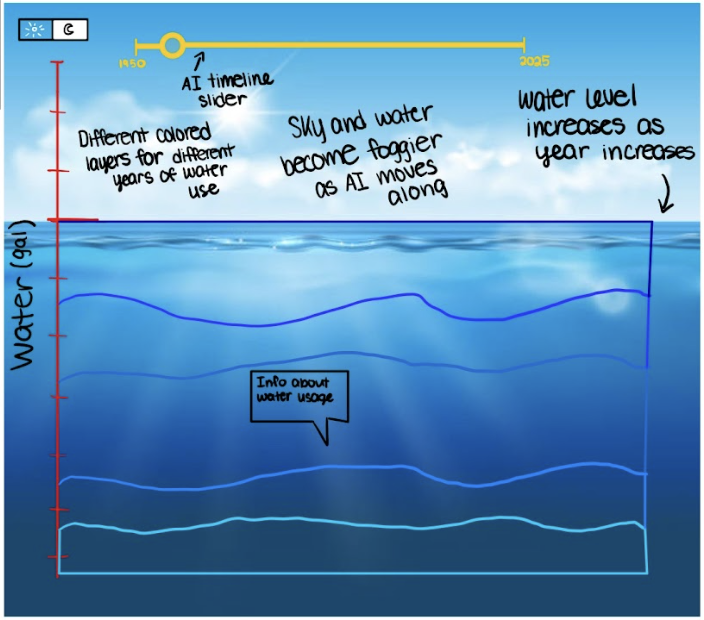 Originally (as seen in our preliminary sketches) we envisioned our sustainability data using an interpretive area chart to show water usage levels across different industries over time. This approach emphasized temporal trends, allowing users to see how water use evolved and how patterns shifted across sectors. However, as we explored our updated dataset and considered cohesion with the AI productivity visualization, we realized that a temporal chart would not fully capture the spatial impact of AI on the environment. Consequently, we pivoted to a map-based approach, focusing on the geographic distribution of water consumption by U.S. data centers. This shift makes the transition from productivity (AI usage) to sustainability (water consumption) more intuitive and allows users to directly contrast these two aspects of AI in a clear and meaningful way.