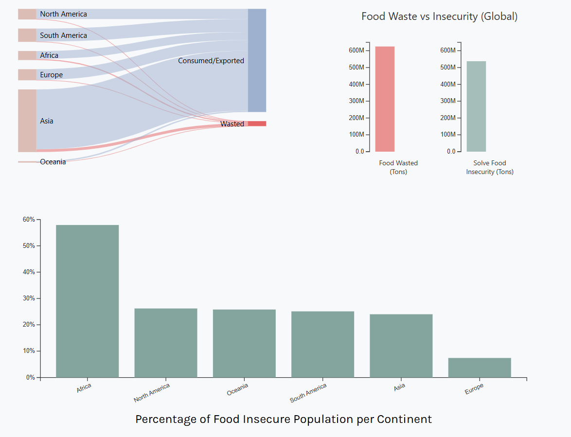 To further explore this relationship, we added interactive functionality allowing users to click on each continent nodeto adjust the accompanying bar charts. This feature isolates regional data, revealing that all continents except Africa have enough wasted food to theoretically resolve food insecurity within their own borders. This insight highlights that redistribution on a domestic or regional scale— rather than international trade — could meaningfully address hunger.