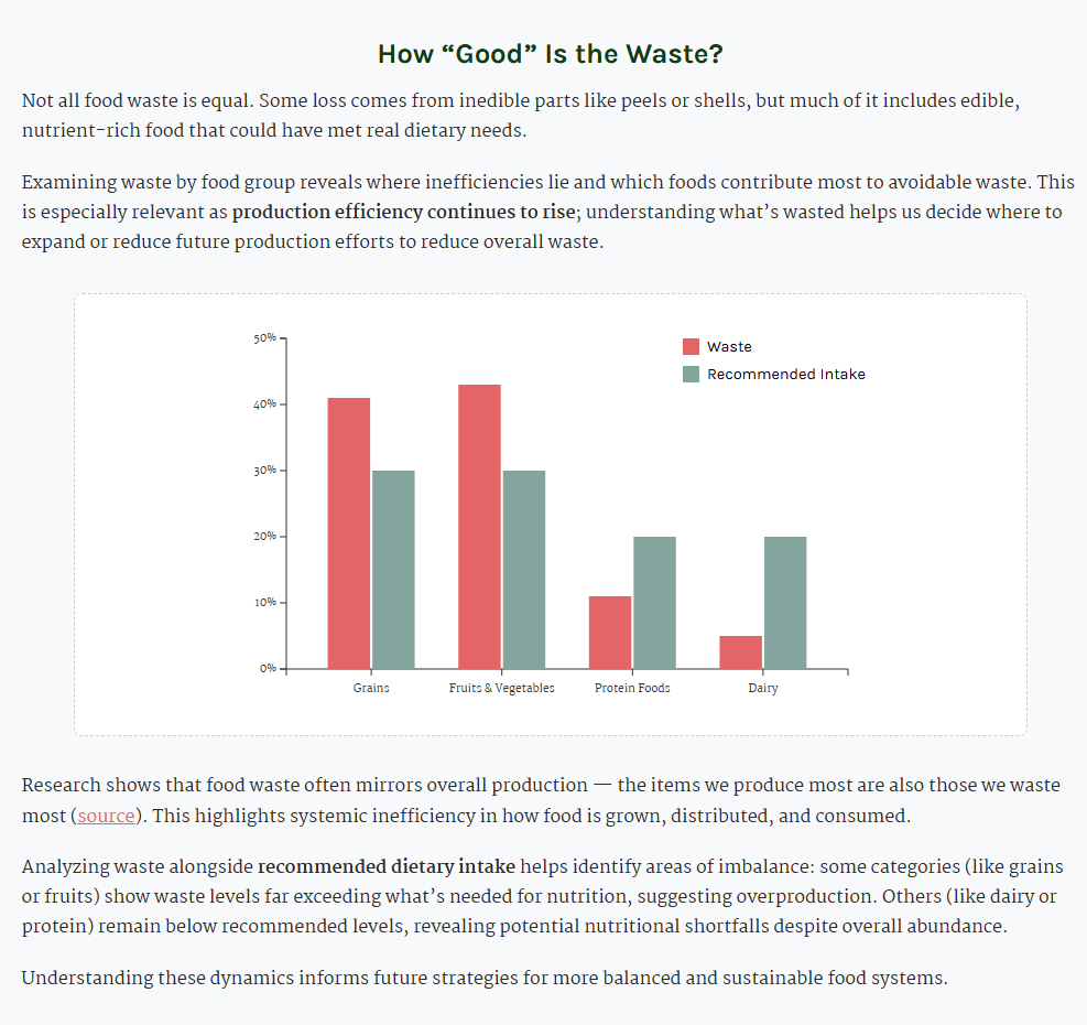 Even though the world produces enough calories to feed everyone, distribution inefficiencies and waste lead to chronic hunger. By visualizing data, our project aims to highlight both the magnitude of wasted resources and their potential to meet human nutritional needs.
