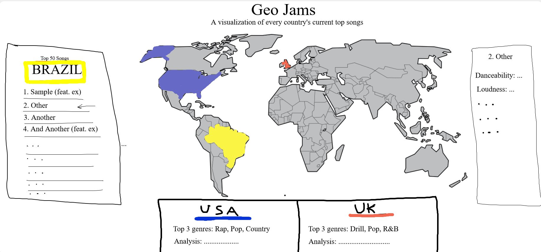 Most of our designs generally have the same key component of a world map in the middle of the visualization. In this design, we considered a sidebar on the left that, when a country is clicked on, highlights the country and allows the user to see the top n songs on Spotify. A sidebar on the right would allow the user to see a specific chosen song's analysis, and the country comparison tool would be under the map.