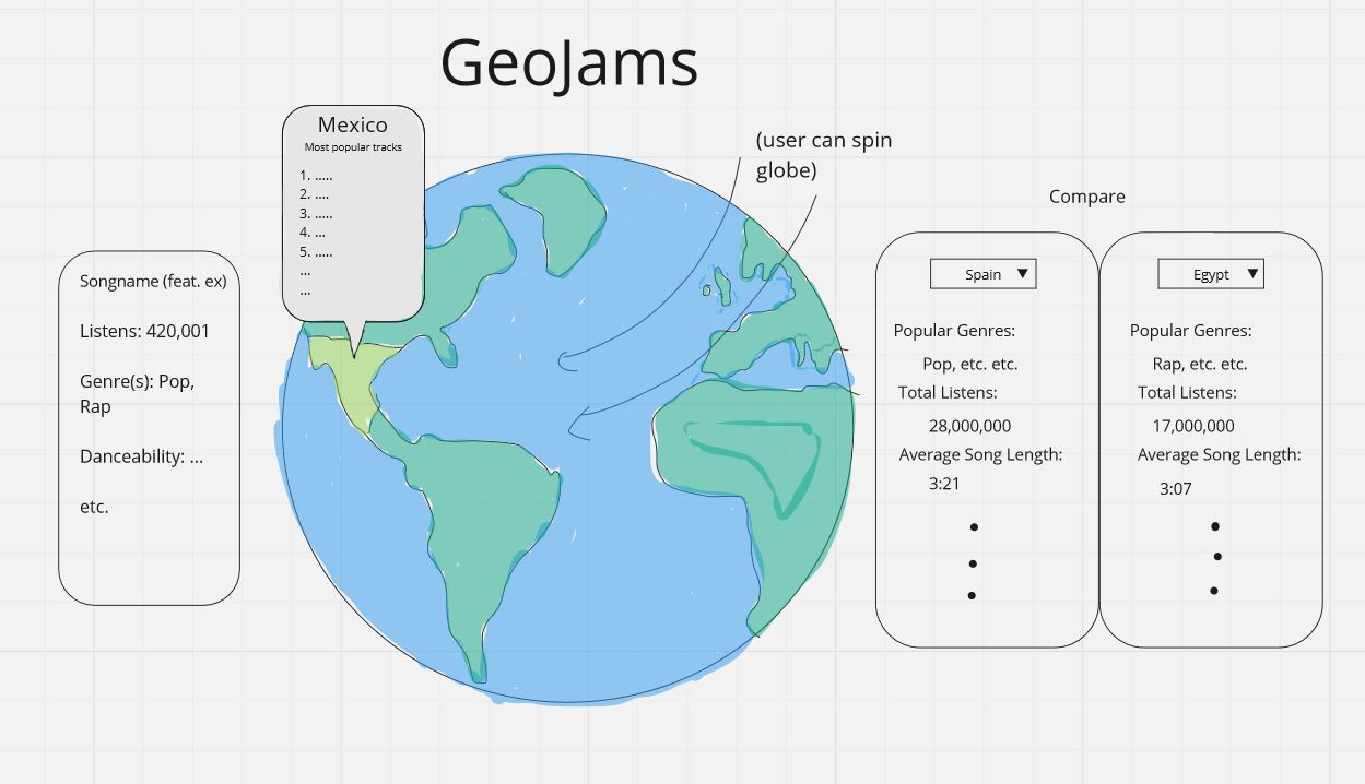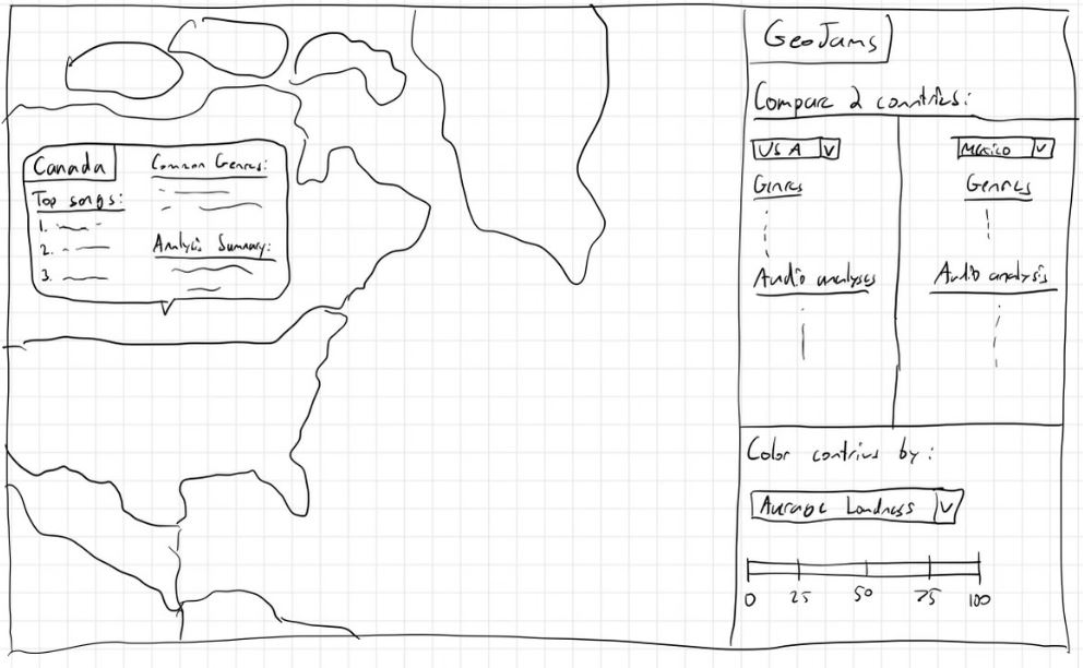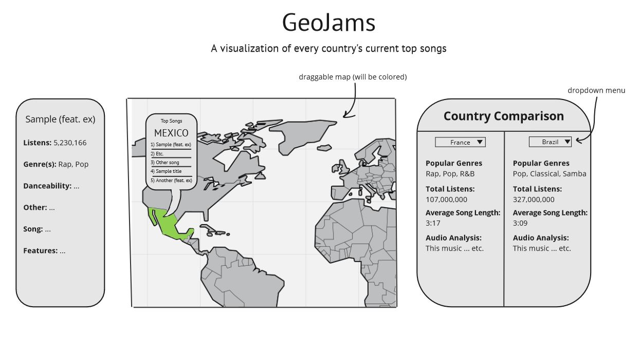 Our final design incorporates ideas from each of the other 3 and we believe provides the cleanest visualization for our purposes. We keep the map in the middle and (maybe) make it draggable, but hovering over a country will still provide a tooltip. Clicking on a country provides the sidebar of song data on the left, and then we have a country comparison tool on the right. We cut down on the number of GUIs from the 1st design and believe this provides a much cleaner look while maintaining the same integral functionality.