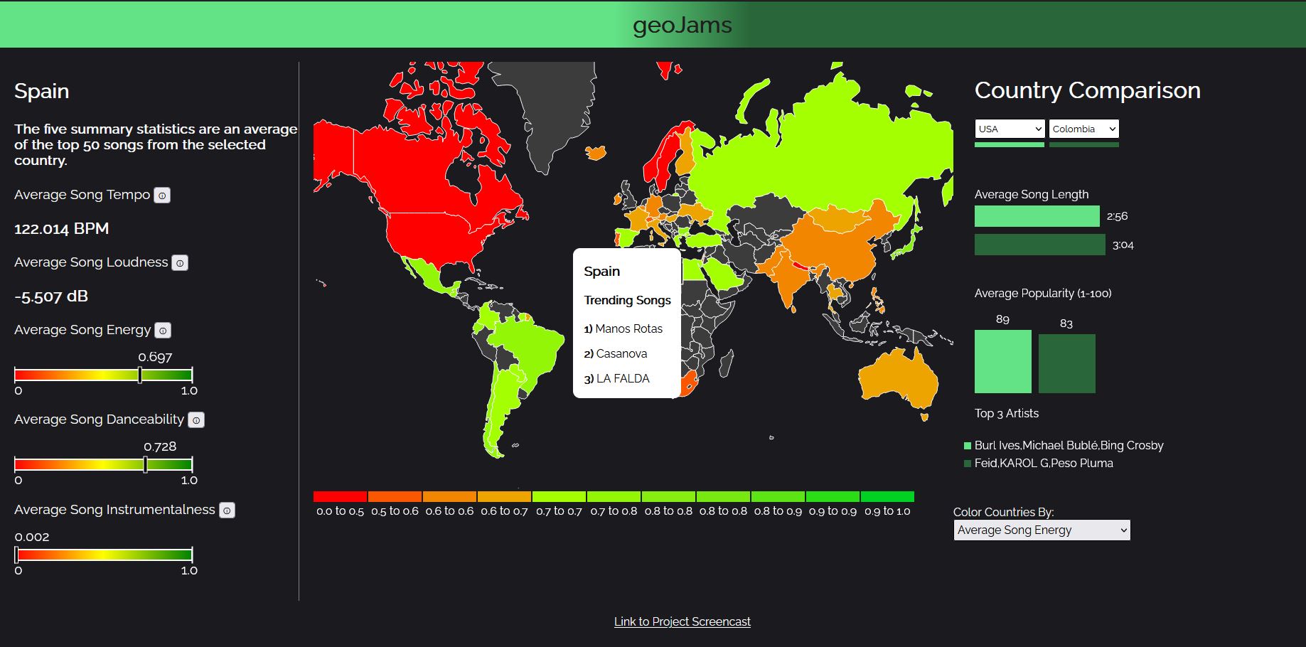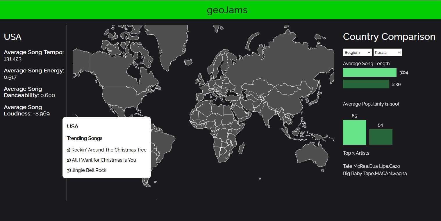 We found the GeoJSON feature of d3 to be especially interesting after doing Studio 7 in class. We wanted to find something we could visualize and compare among countries and decided music would be a great way to implement both.