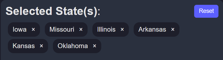 Click on a state from the map to select a state, you can select a maximum of six states together to view aggregated data of them. The × button allows you to remove the corresponding state from selection. By default, our graph displays data for the whole USA. "Reset" clears all selection.